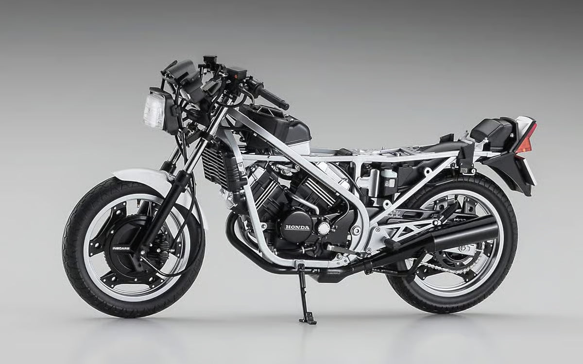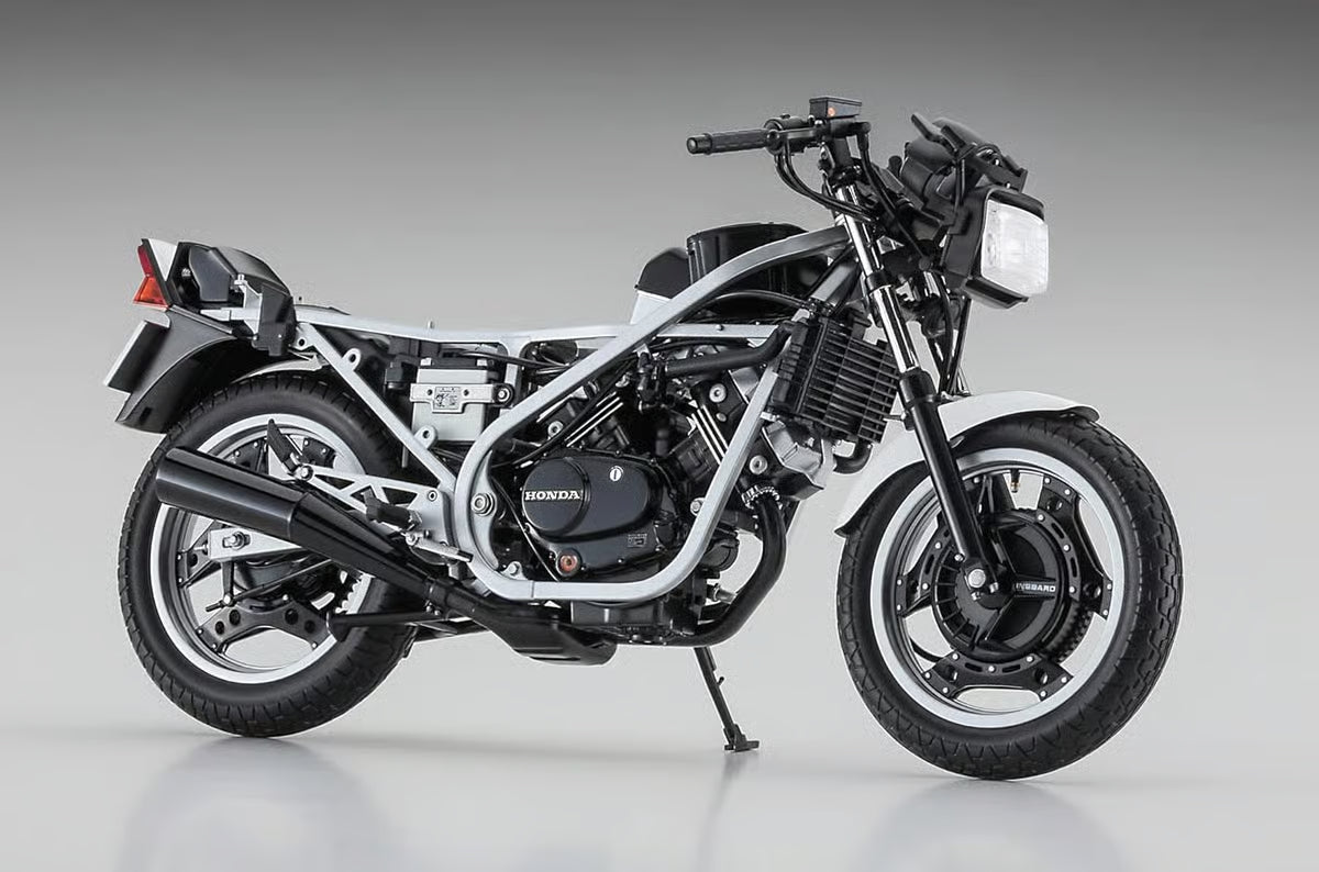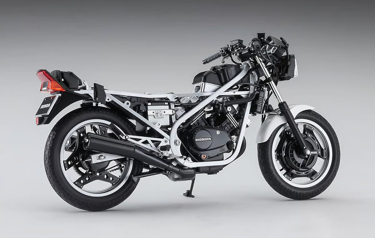 The 1/12 Hasegawa Honda VT250F (MC08) model kit meticulously recreates the 1984 second-generation VT250F, a 250cc road sports motorcycle known for its water-cooled 90-degree V-twin engine and refined performance. Celebrated for its four-stroke engine's ease of use, this bike gained popularity among diverse riders, from sports enthusiasts to women and business users.