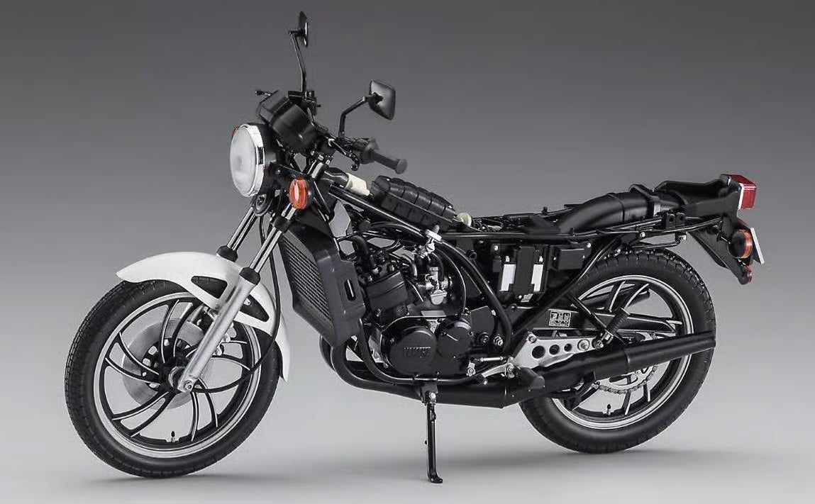This meticulously researched kit faithfully reproduces the original, including white tank parts and plated headlight, taillight, mirror surfaces, and seat handle. Model dimensions are 174mm in length and 65mm in width.