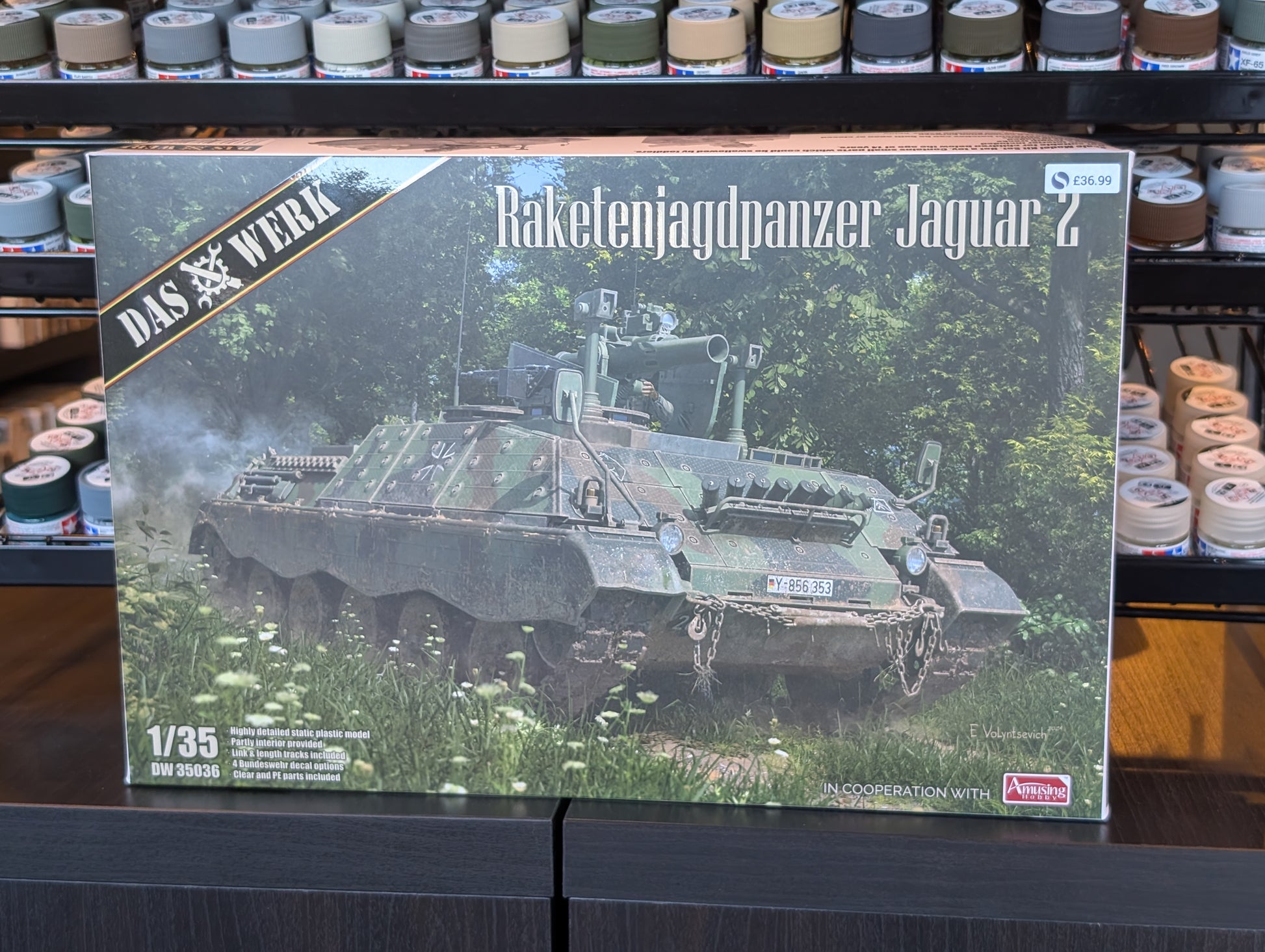 The 1/35 Das Werk Raketenjagdpanzer Jaguar 2 kit (designed in partnership with Amusing Hobby) captures the late Cold War West German tank destroyer, equipped with TOW anti-tank missile launchers and based on the chassis of the Kanonenjagdpanzer. It served as a key element in the Bundeswehr's anti-armour strategy through the 1980s, offering a low profile and high mobility combined with powerful guided weaponry.