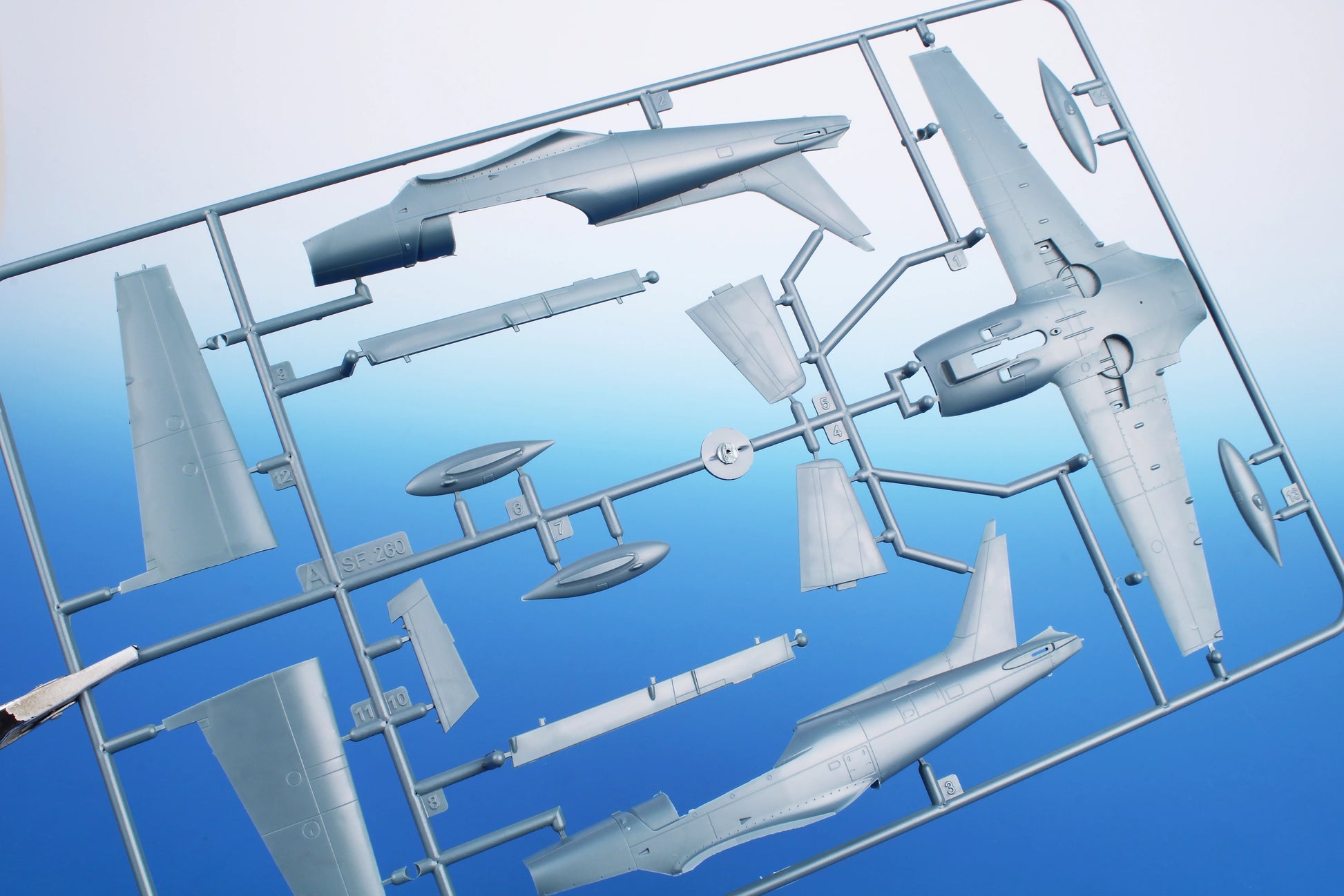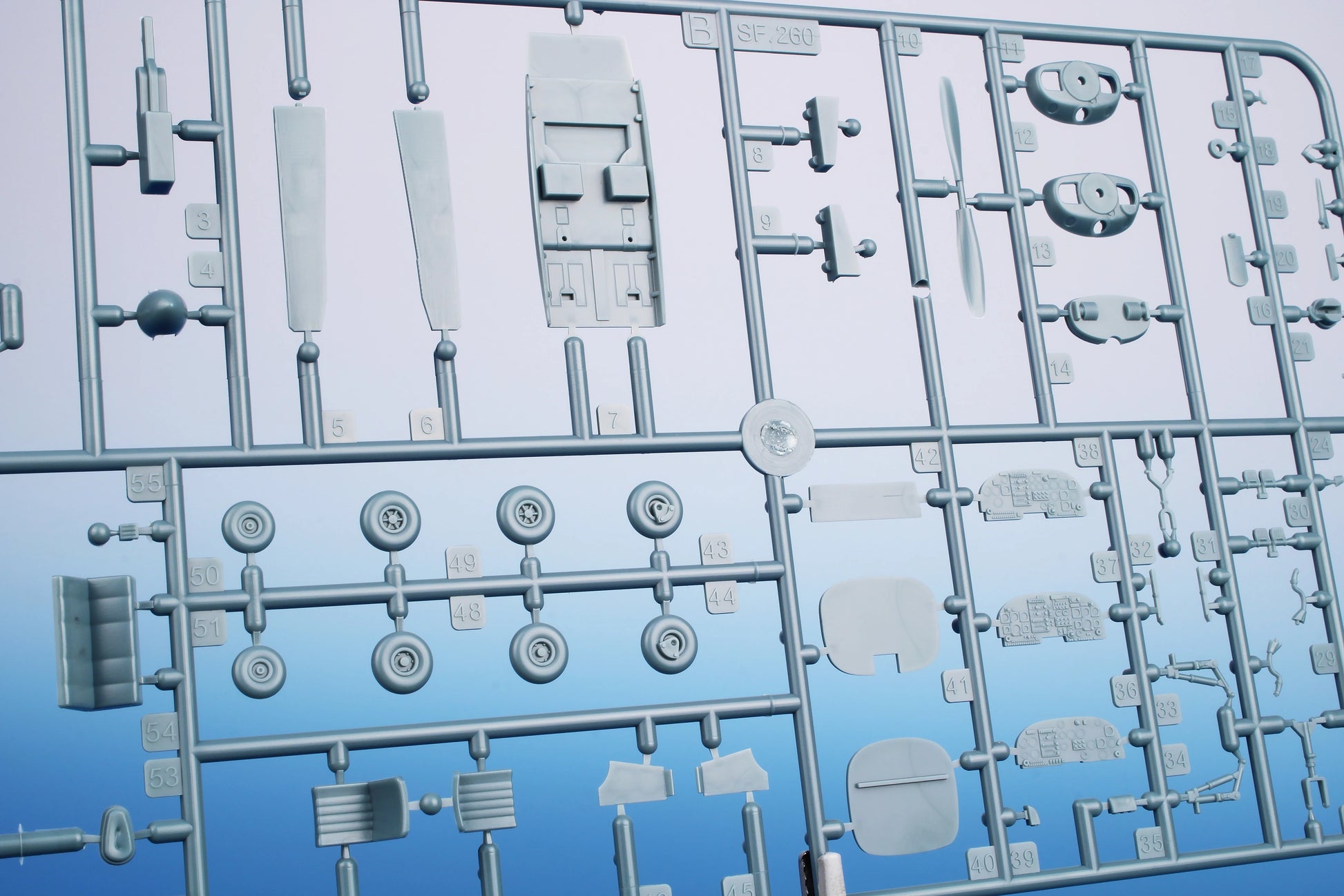 This kit presents the later version with a taller, bulged canopy, provided on three styrene sprues including clear parts for the updated canopy. The included decals represent aircraft from Italy, Belgium (standard and aerobatic liveries), Venezuela, and Uruguay, showcasing precise stencils unique to each airframe. Compared to other SF-260 kits, this model delivers sharper details and the correct canopy version.