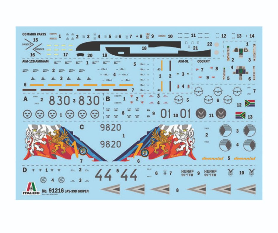 This 1/72 scale Italeri kit accurately reproduces the sleek design of the twin-seat Gripen. It includes finely engraved surface details, a detailed cockpit with two crew positions, external fuel tanks, and a selection of weapon loadouts. Clear parts are provided for the canopy, and the kit comes with decals for multiple marking options, enabling modellers to recreate aircraft from various international operators.