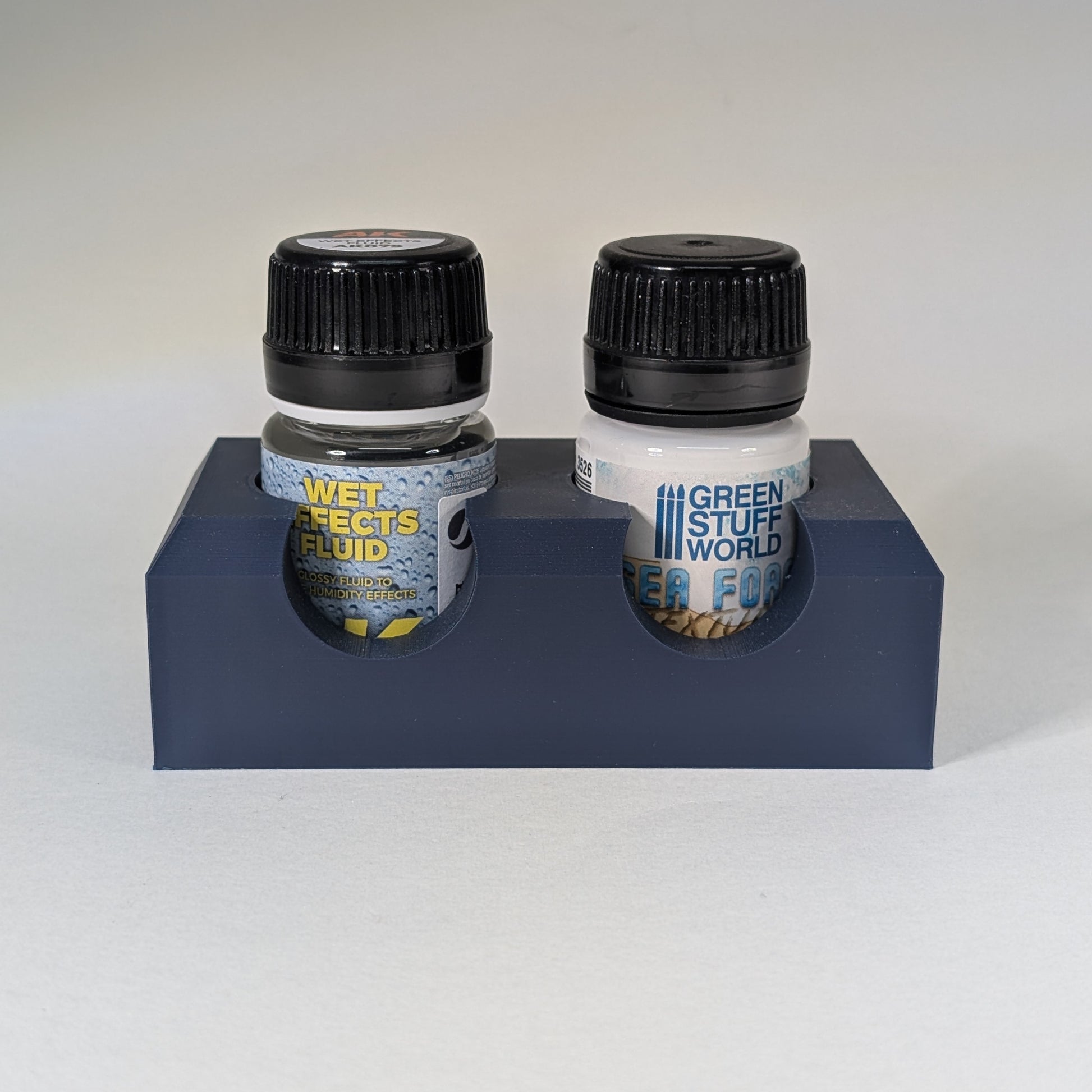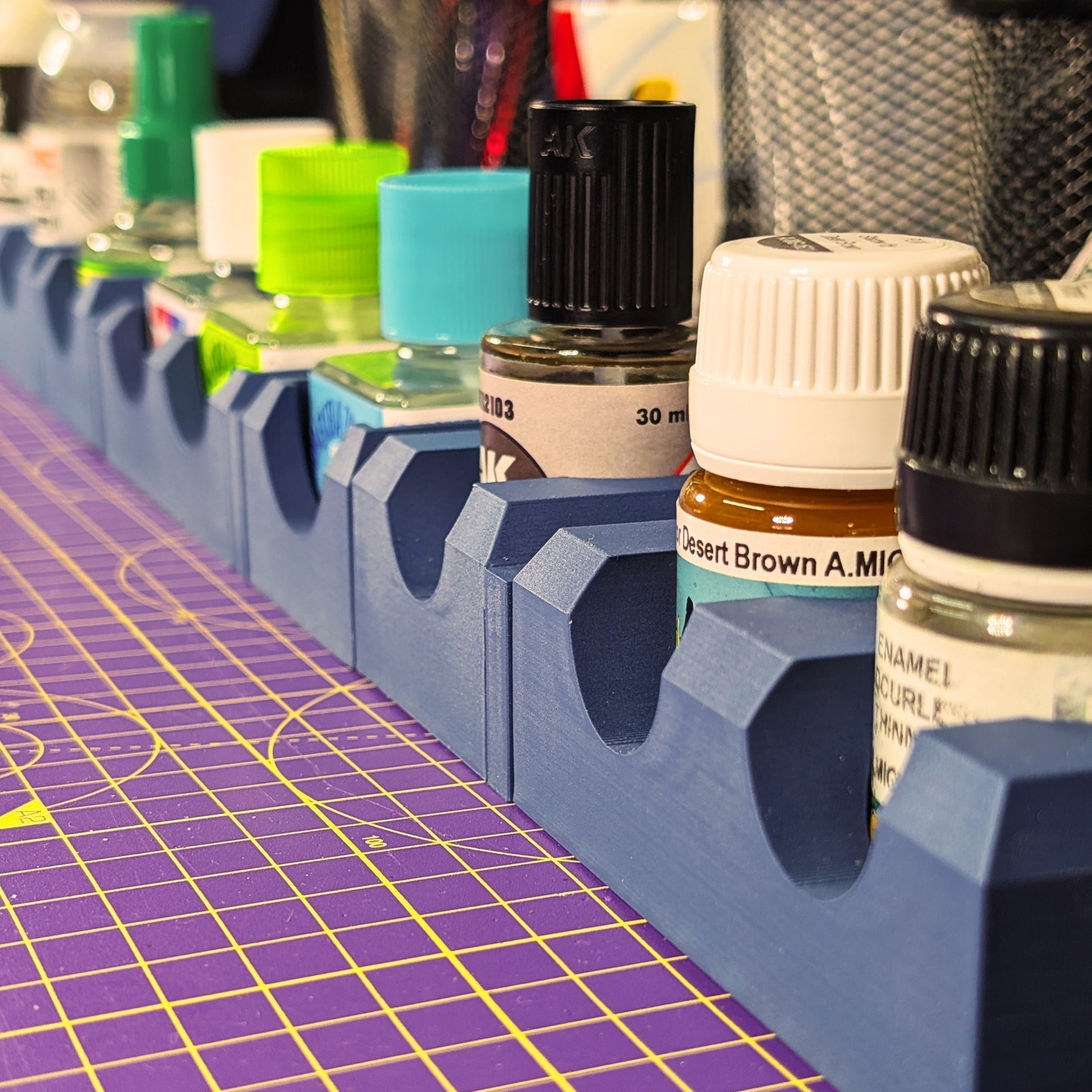 Our exclusive 3D printed holders in SuperModels' signature navy blue are designed to keep your hobby bench tidy and secure. With a 35mm tolerance, they’re a perfect fit for bottles from brands like Tamiya, Vallejo, Ammo by MIG, AK Interactive, Green Stuff World and many more.
