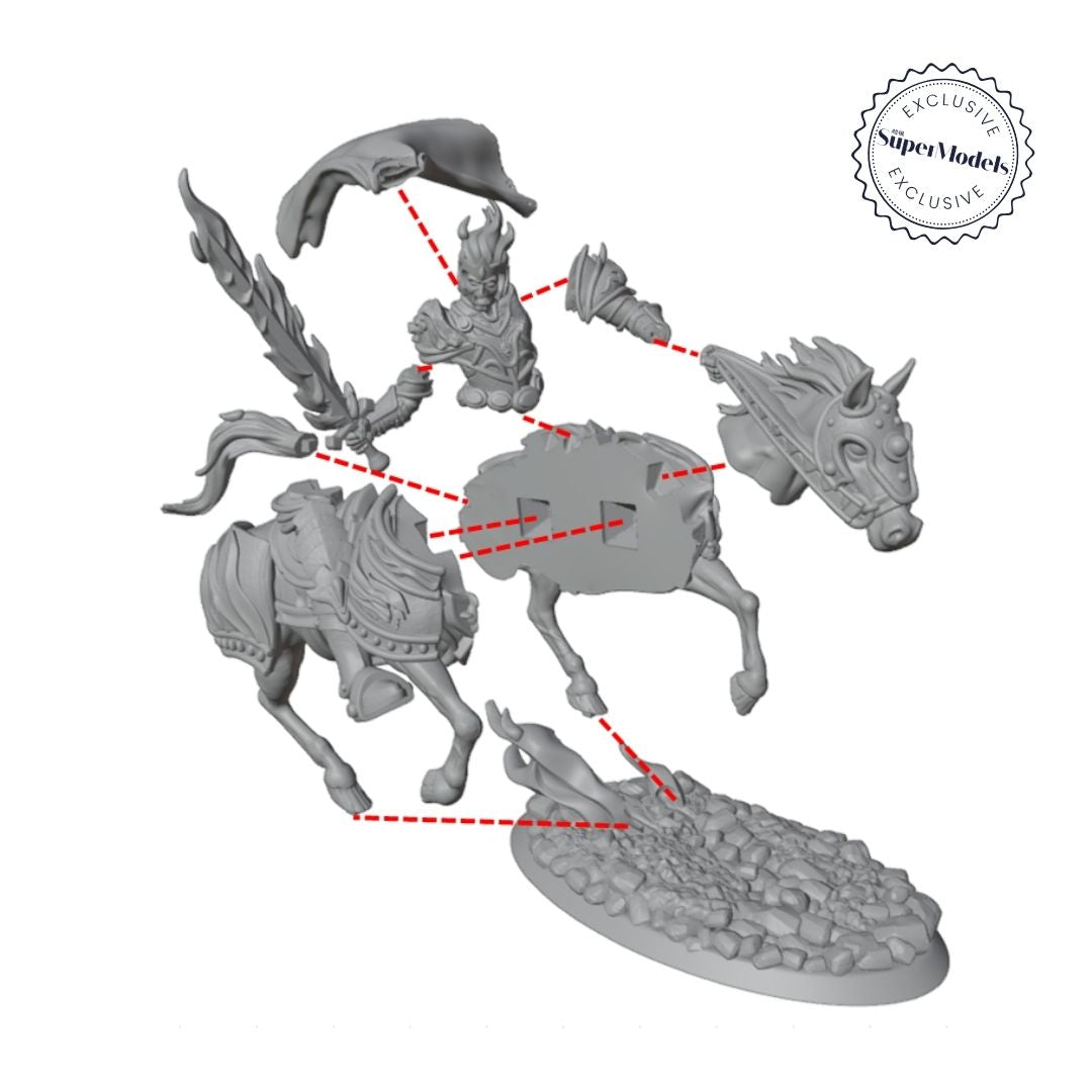 Raised by the Valkyrx as Living Spirit following his valorous death at the hands of the Wearg he now leads the alliance of dragon, elves and dwarves against the Demon King. In company with his Knights he rides his spectral horse with flaming sword dealing death to mortal foe and demon alike.